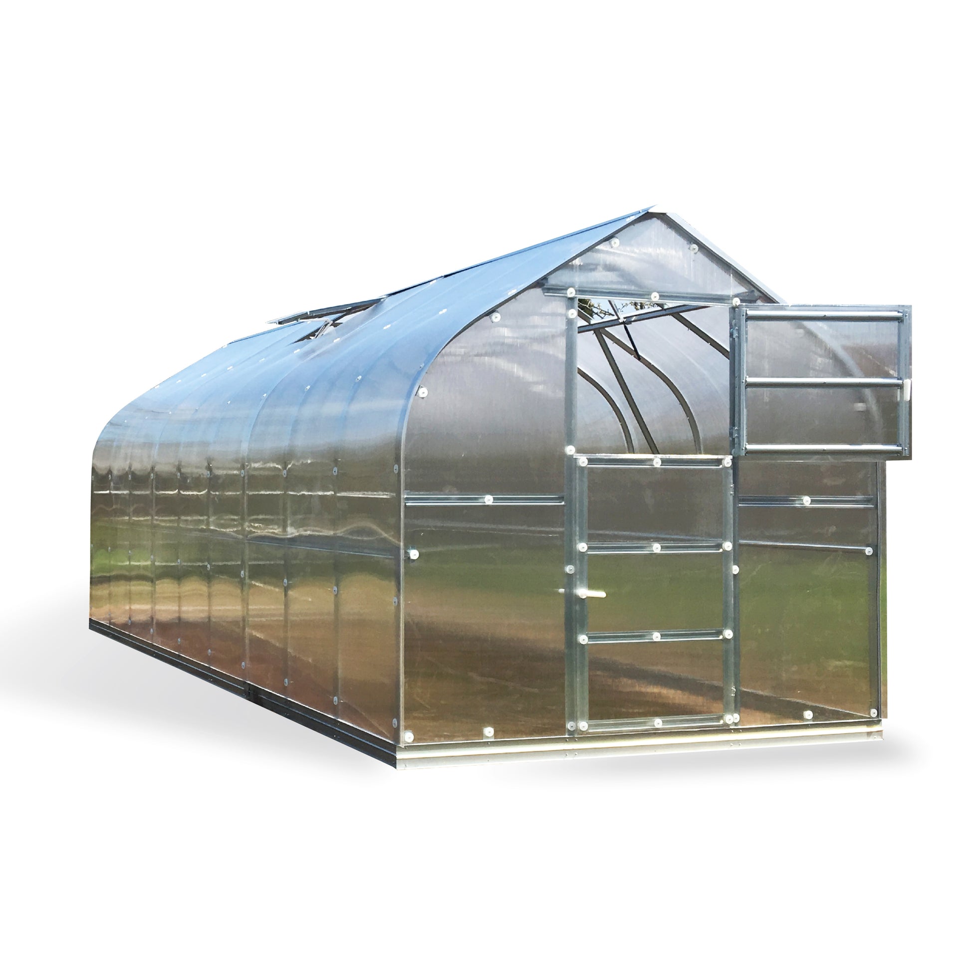 - Tämän kasvihuoneen ehdoton vahvuus on se, että päällyskatteen levyt asennetaan isoina paloina, ne toimitetaan rullassa ja levyt leikataan asennettaessa asennusohjeen mukaisesti. Suuremmilla levyillä asennettaessa kasvihuoneeseen tulee vain vähän saumakohtia, jolloin pinta on yhtenäisempi ja vähemmän altis tuulen ja lumen aiheuttamille haitoille.