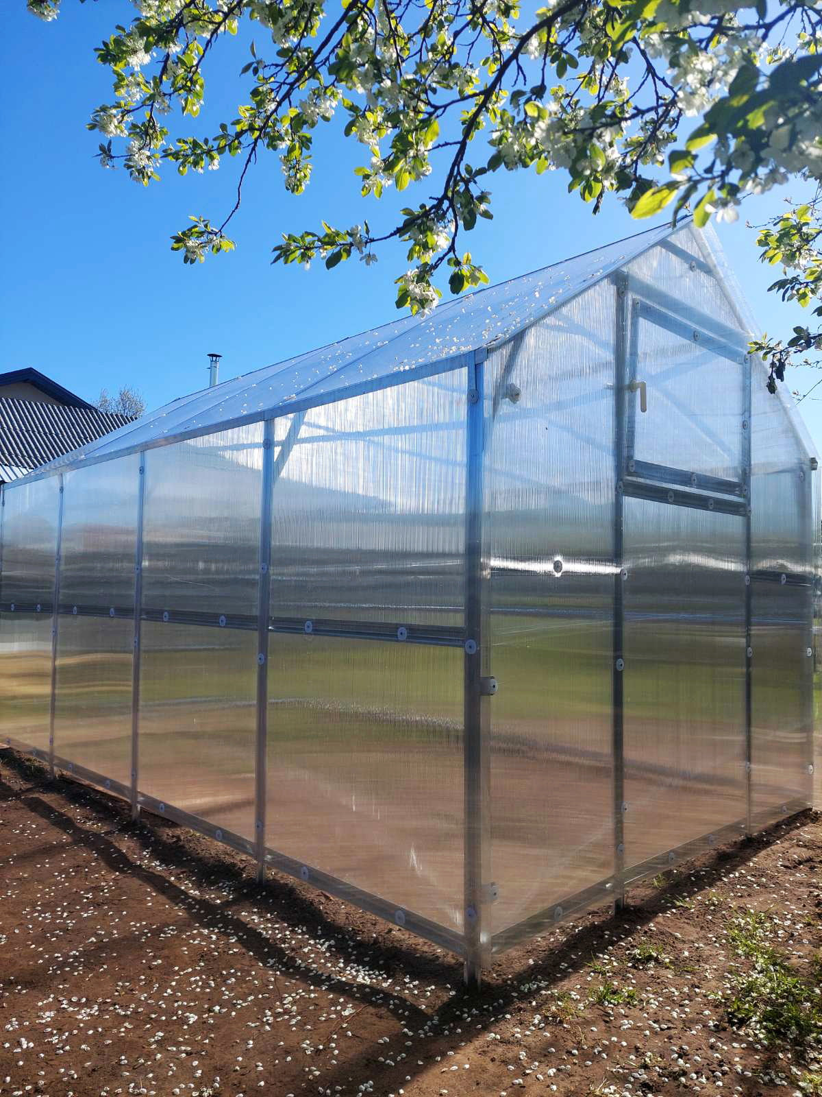 - Kasvihuoneen mitat: leveys 2,35 m, pituus 4 m, korkeus 2,35 m, pinta-ala 9,4 m².