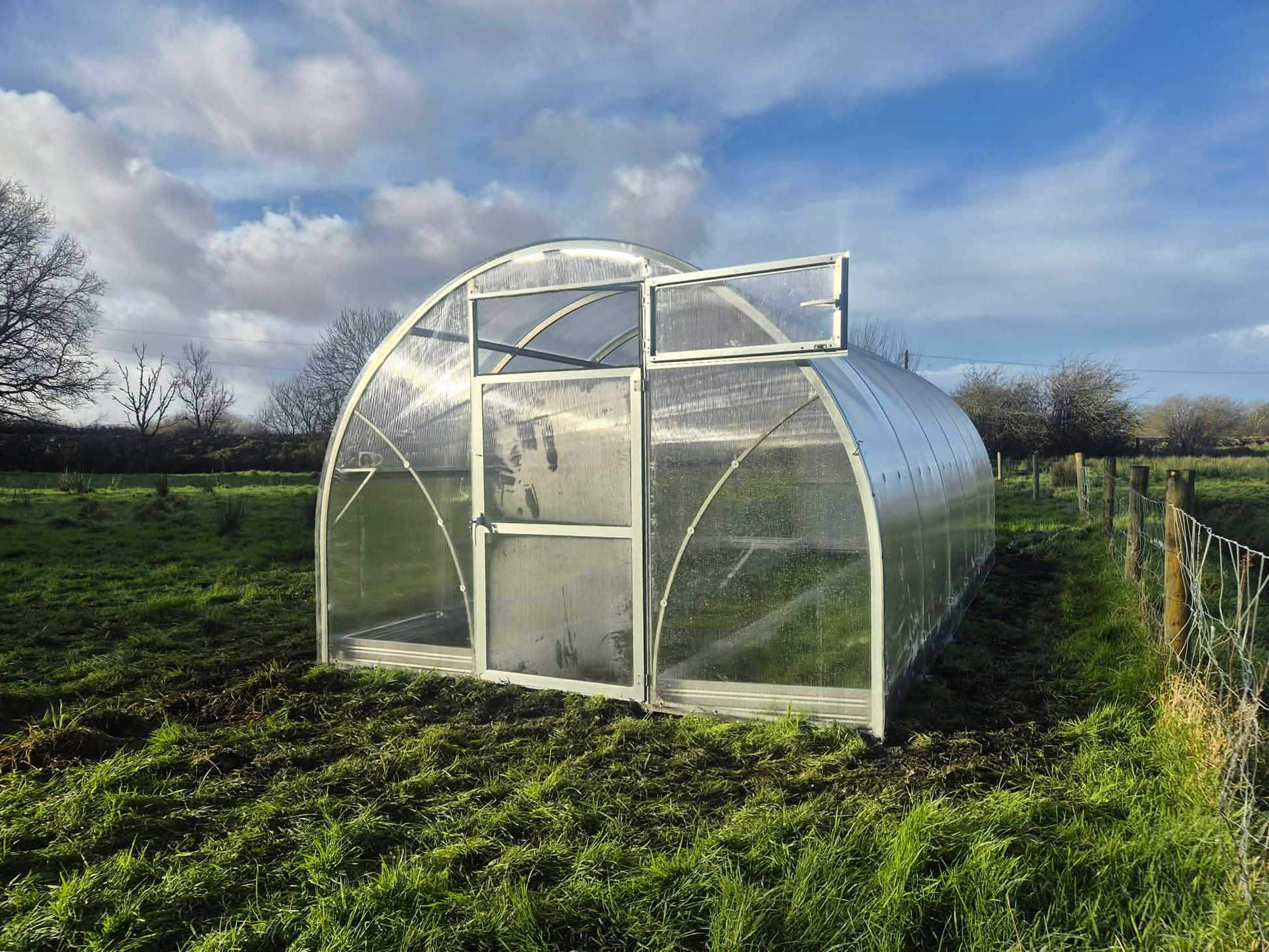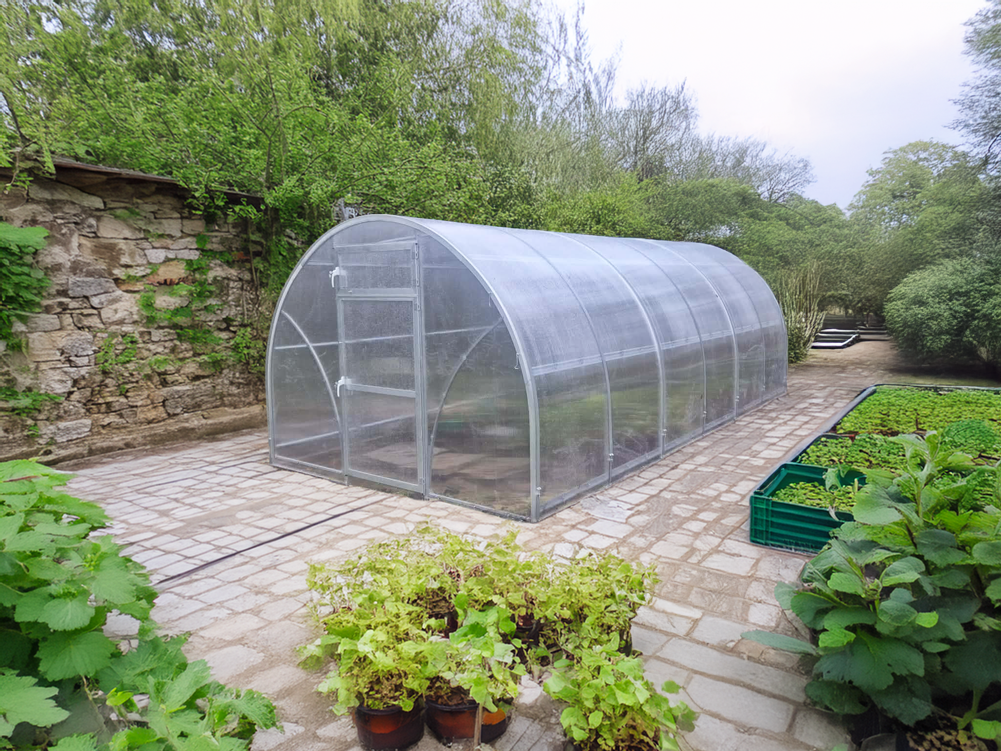 Kasvihuoneessa on raskas galvanoitu teräsputkirunko 20x40 mm 1 mm:n materiaalivahvuudella ja 6 mm UV-suojatut polykarbonaattikennolevyt. Nämä takaavat kasvihuoneelle pitkän käyttöiän ja hyvän säänkestävyyden. Kaareva muoto ohjaa lumen ja tuulen tehokkaasti sivuille.