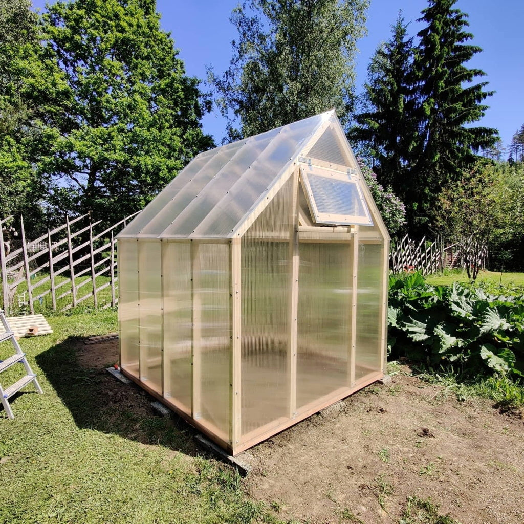 - Kasvihuoneen runko on valmistettu korkealaatuisesta skandinavialaisesta kuusesta. Päällyskatteena kasvihuoneessa on iskunkestävä ja UV-suojattu 4 mm tai 6 mm:n polykarbonaattikennolevy. PC-kennolevyllä on hyvä valonläpäisevyys ja lämmönpitävyys.