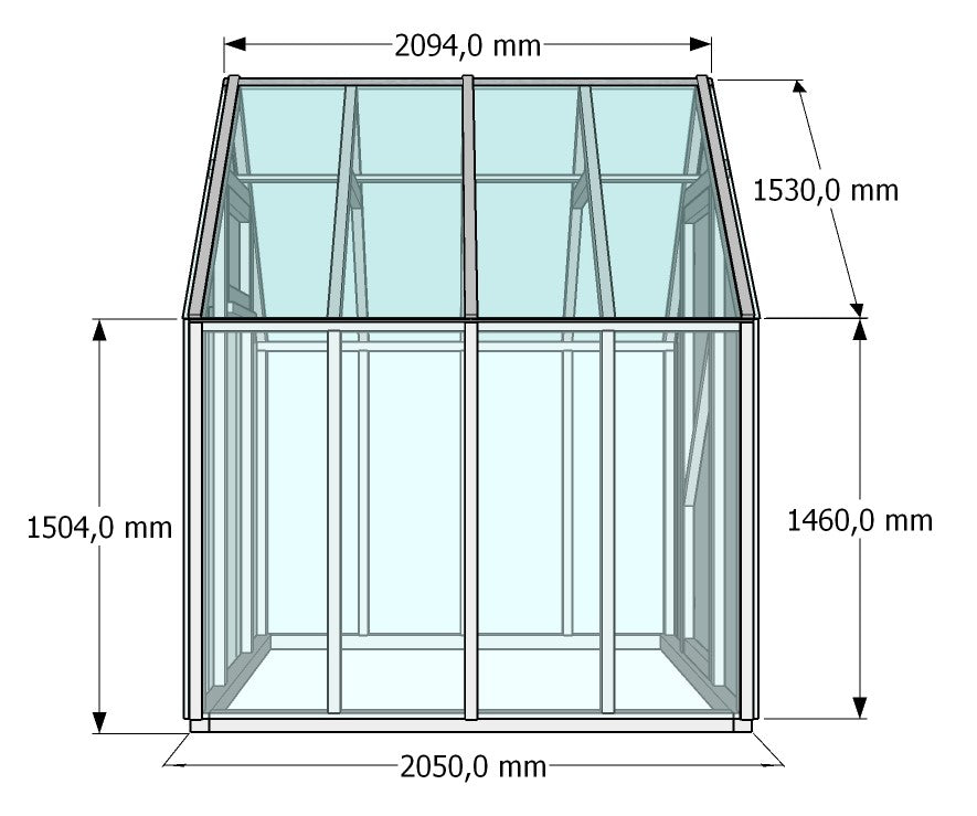 - Kasvihuoneen mitat: leveys 2,1 m, pituus 2,05 m ja korkeus 2,5 m. Pinta-ala 4,3 m². Sivuseinän korkeus 1,5 m.