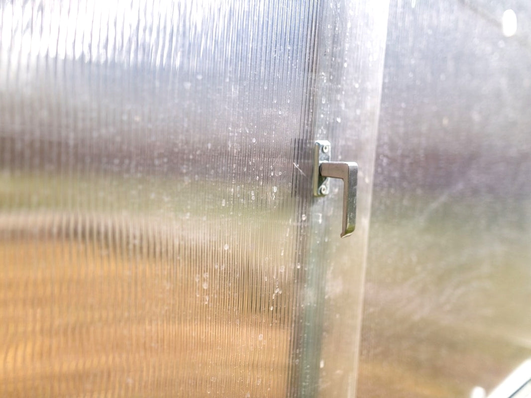 - Kasvihuoneessa on omilla saranoillaan toimiva kaksiosainen ovi toisessa päässä. Kasvihuoneen toisessa päässä on tuuletusluukku.