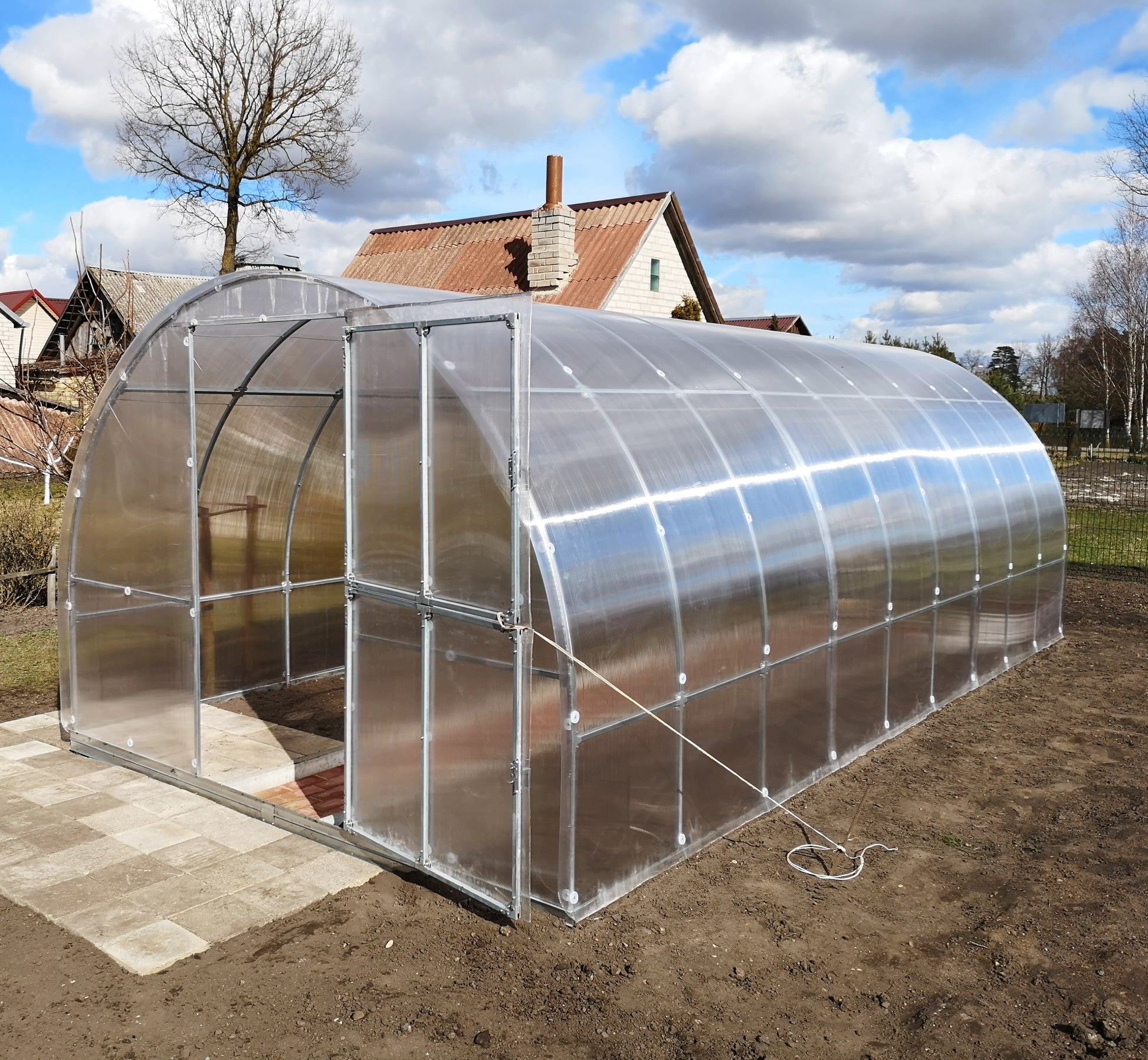 - Kasvihuone asennetaan suoraan maaperään pakkauksen mukana tulevilla maa-ankkureilla. Maa-ankkurit kaivetaan maahan noin 35 sentin syvyyteen.
