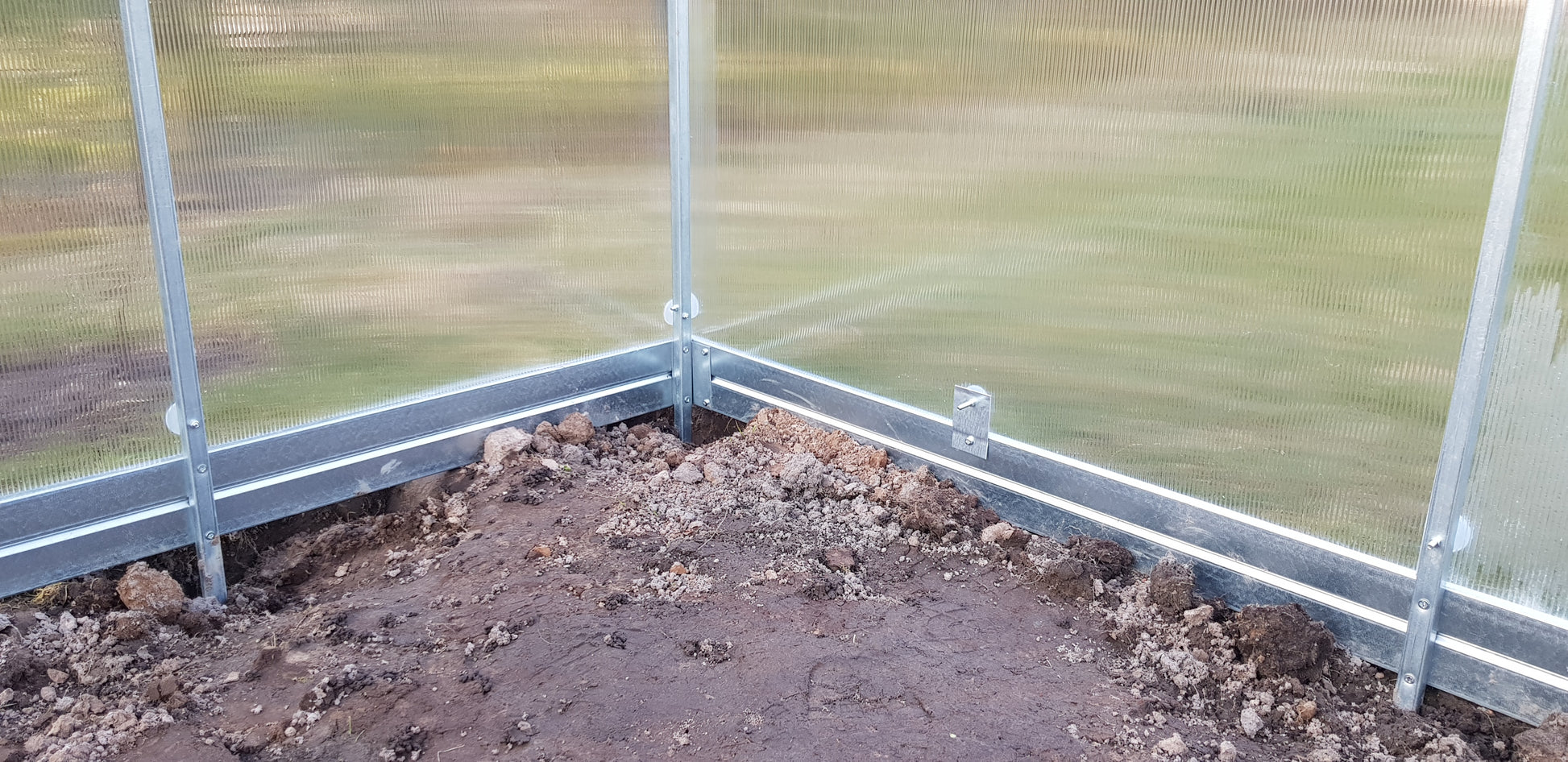 - Kasvihuone asennetaan suoraan maaperään pakkauksen mukana tulevilla maa-ankkureilla. Maa-ankkurit kaivetaan maahan noin 35 sentin syvyyteen.
