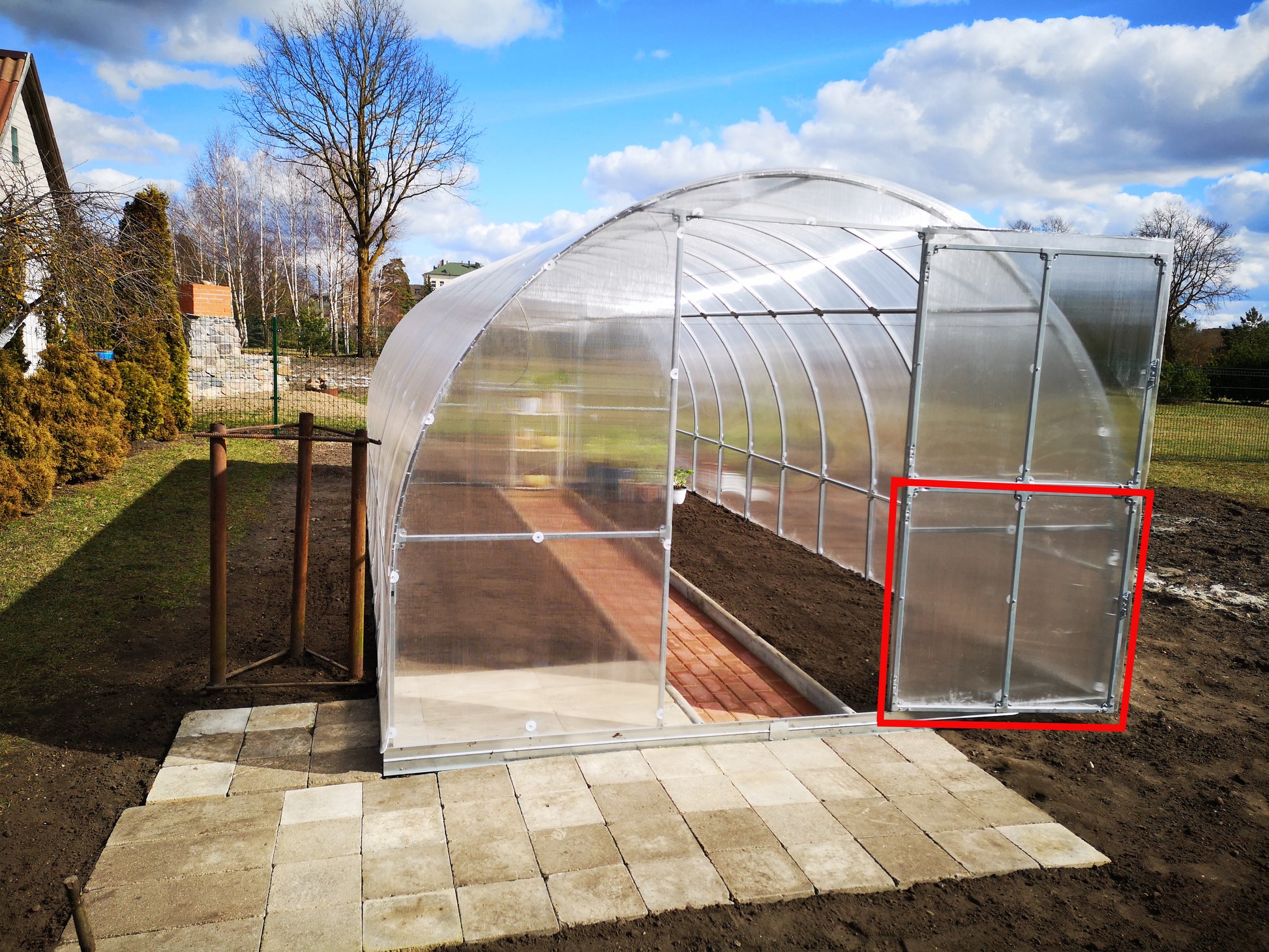 - Lisäovi (alaosa) vakiovarusteena olevan tuuletusluukun alle Quadra Strong -kasvihuoneen takaseinään.