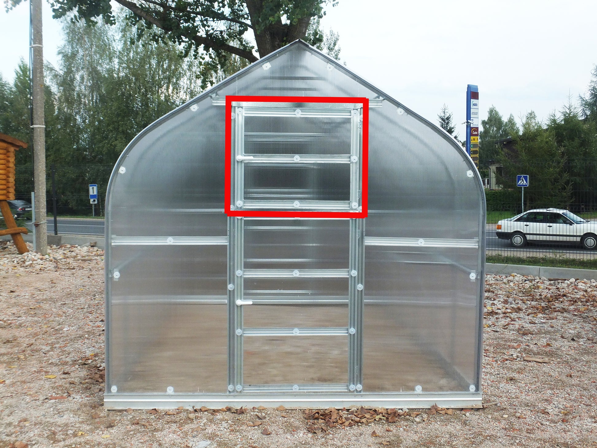 - Tuuletusluukku (yläosa) Omega Drop -kasvihuoneen takaseinään.